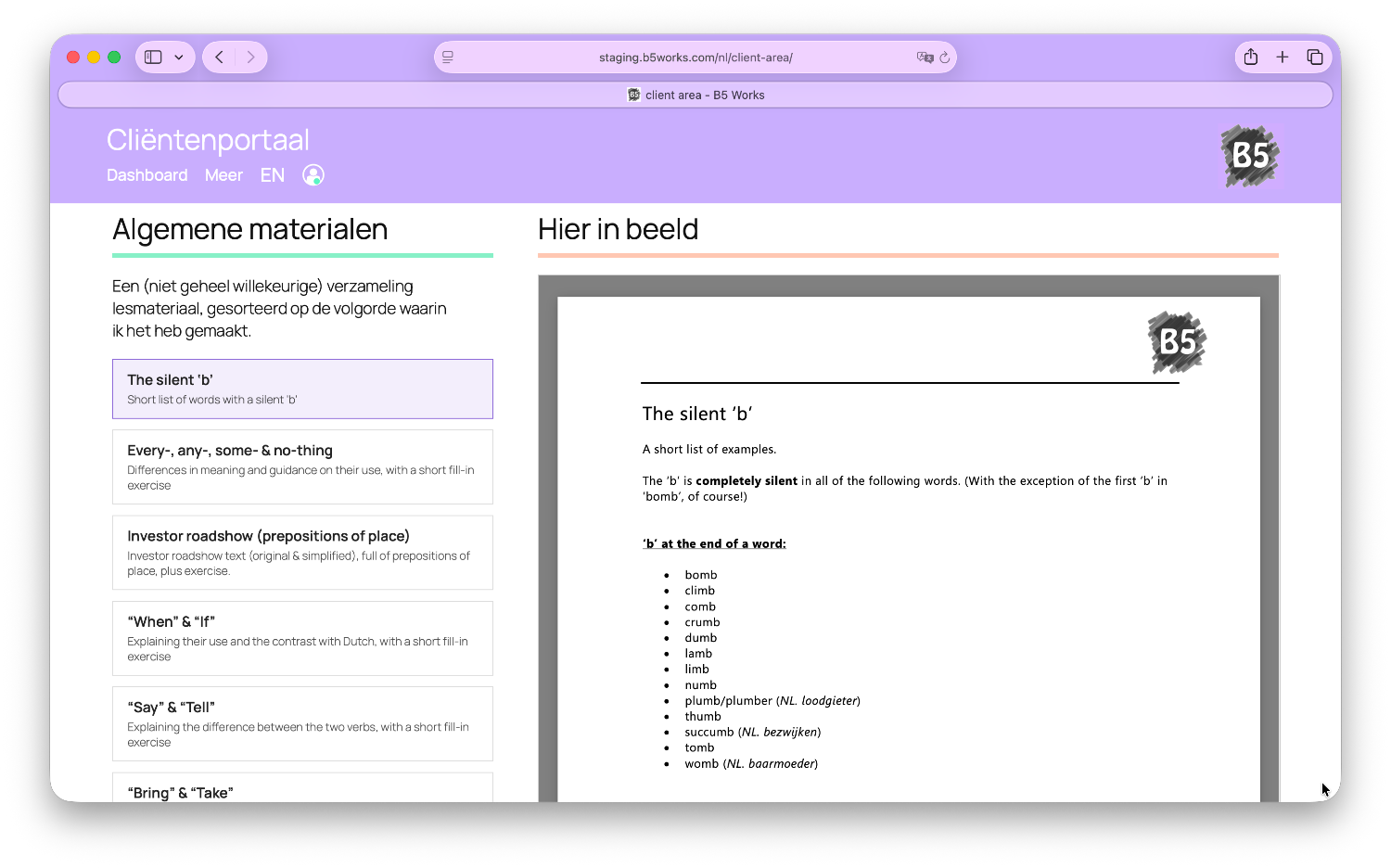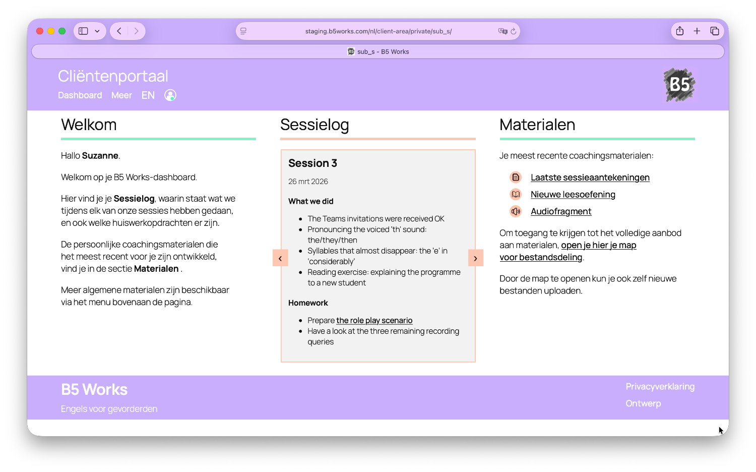 Je krijgt beveiligde toegang tot een persoonlijk dashboard binnen het B5 Works-cliëntenportaal. Hier vind je onze sessielog, waarin wordt bijgehouden wat we in elke sessie hebben gedaan en welke huiswerkafspraken we hebben gemaakt.